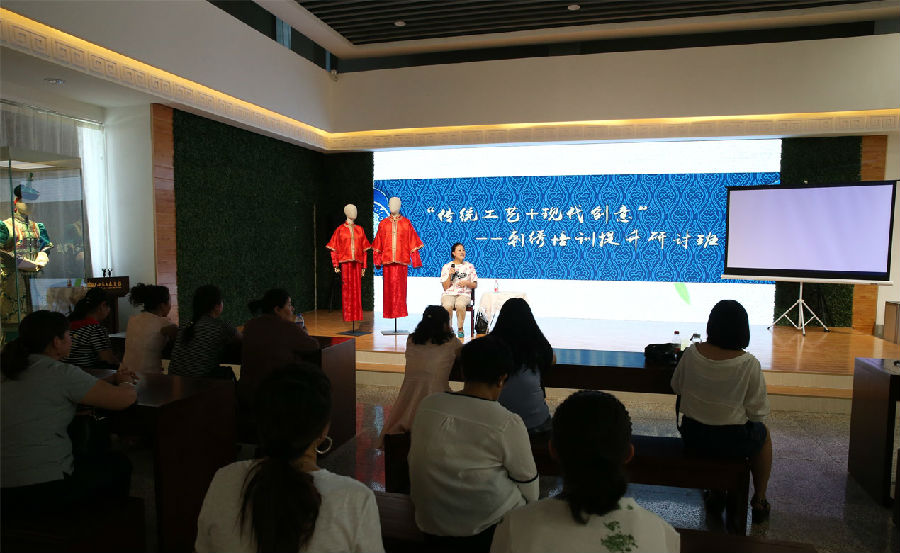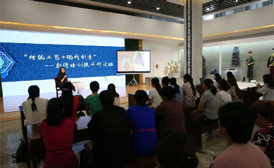 内蒙古工业大学轻纺学院的严亦农副教授为科右中旗绣娘们做了题为“刺绣的艺术构成形式及在现代服饰中的应用”的讲座