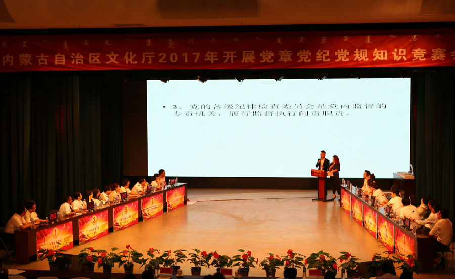 2017年5月26日下午,区直文化系统党章党规党纪知识竞赛在文化大厦五楼剧场拉开战幕,个人必答、集体必答、抢答和风险选答,经过一番激烈的你抢我答内蒙古展览馆代表队在10支参赛队伍中脱颖而出荣获三等奖 。