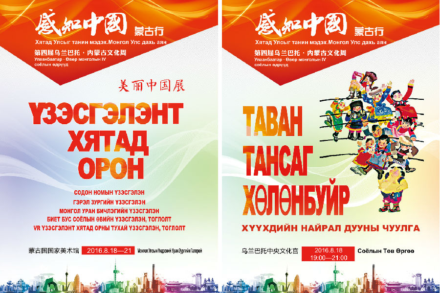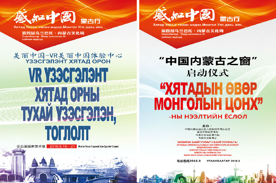 2016年8月18日至8月21日,由国务院新闻办公室、内蒙古自治区人民政府、中国驻蒙古国大使馆、蒙古国教育文化科学部主办的“感知中国•蒙古行——第四届乌兰巴托•内蒙古文化周”活动在蒙古国首都乌兰巴托举办。本次活动包括文艺演出、非遗表演、图片展览、图书联展、蒙古文书法展等五大类十多项具体活动。由内蒙古展览馆承担会场布置、会场设计、宣传设计和非遗表演等工作。